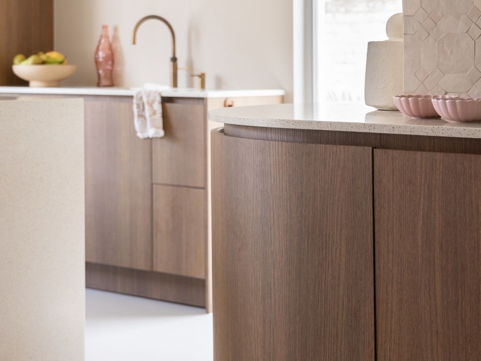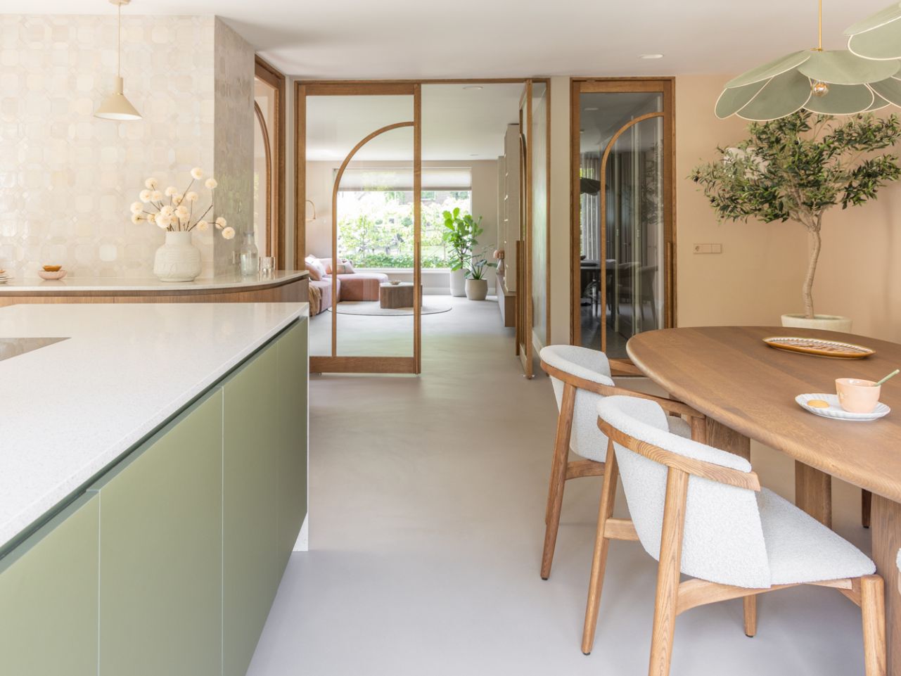 Het interieur kenmerkt zich door karaktervolle keuzes en veel maatwerk. De nieuwe zij-entree en uitbouw creëren een logische, ruimtelijke routing, terwijl houten taatsdeuren met organische vormen de verschillende ruimtes verbinden.