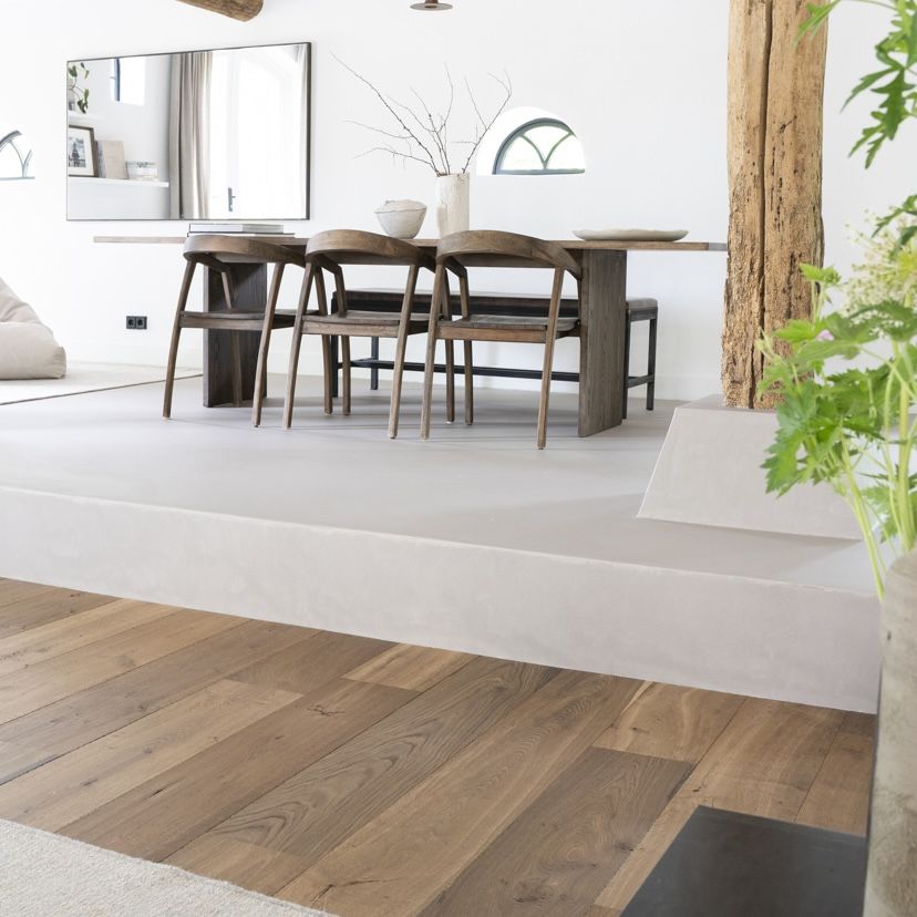 Een houten vloer in combinatie met een gietvloer zorgt voor balans tussen warmte en strakheid. Omdat een gietvloer onderhoudsvriendelijk is en beter bestand tegen vocht en vloeistoffen, wordt deze vaak gekozen voor functionele ruimtes zoals de keuken of het eetgedeelte. Vanuit daar kan de gietvloer naadloos overlopen in een houten vloer richting de woonkamer, waar sfeer en comfort centraal staan. Zo ontstaat een logisch en stijlvol geheel, waarin elke ruimte zijn eigen functie en uitstraling behoudt.
